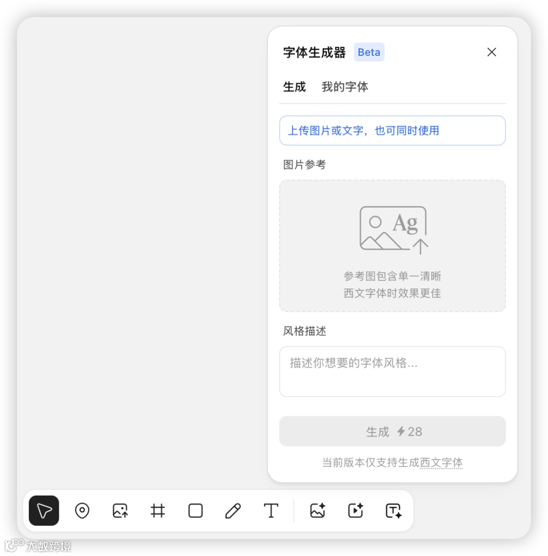 之后上传到画布里面,选择「从画布上传」,注意当前只能生成西文版本的字体,风格描述可以不选。