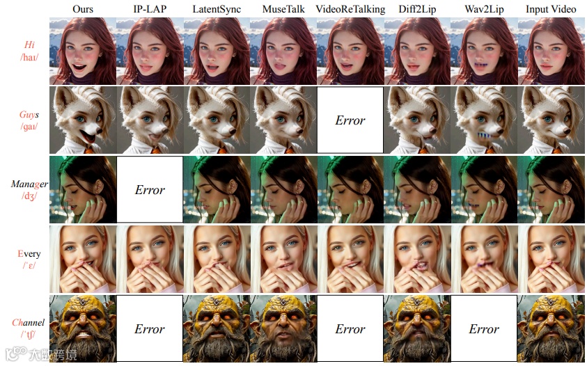 与以往方法在不同对象和音素上的定性比较。该方法能够实现更准确的唇形同步,并更好地保留角色身份。