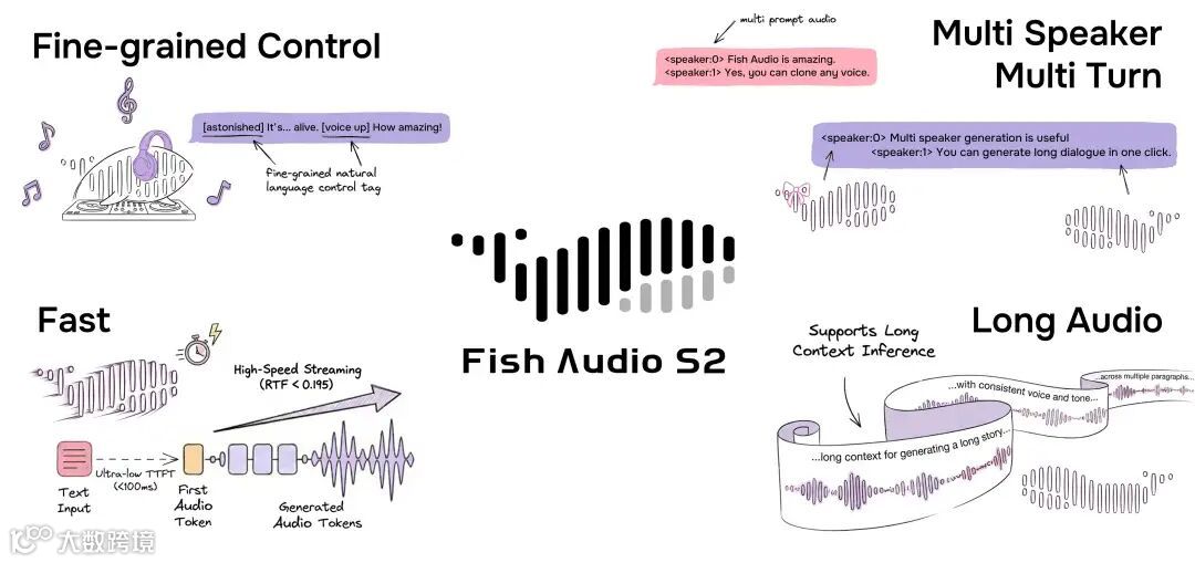 Fish Audio S2 是当前最强的开源文本转语音系统,支持用自然语言指令(如"[小声][大笑]")实现细粒度情感控制,原生胜任长篇合成、多角色对话等复杂场景。其三大创新: