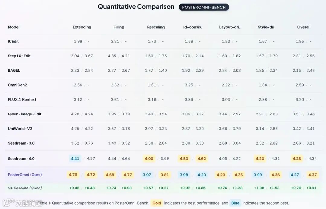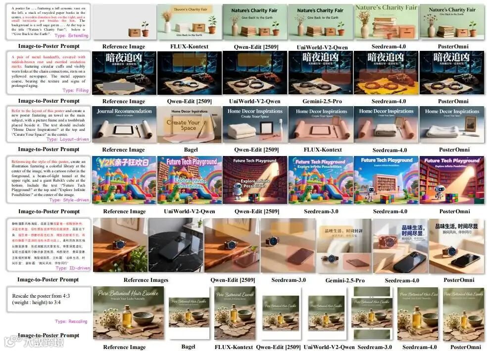 基准测试领先:在PosterOmni-Bench基准测试中,PosterOmni在参考遵循度、全局构图质量和美学和谐性方面,均超越了现有开源基线,甚至超越了部分专有系统。