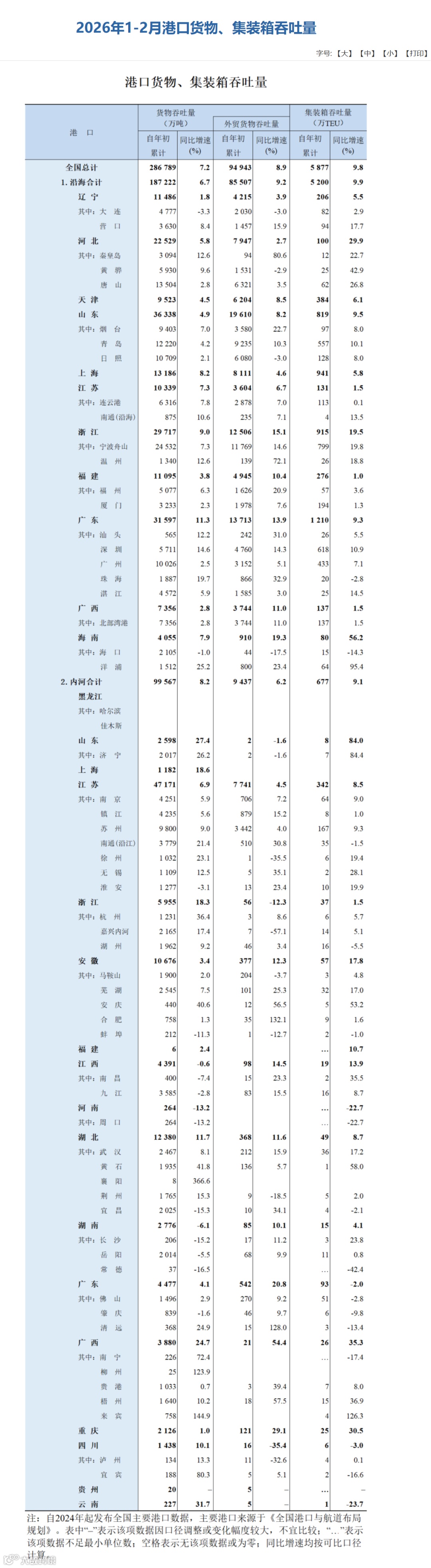 招商港口旗下码头数据也呈现明显分化:2026年1月,长三角码头集装箱量同比增长1.3%,珠三角码头增长10.1%,华南货源表现显著优于长三角。