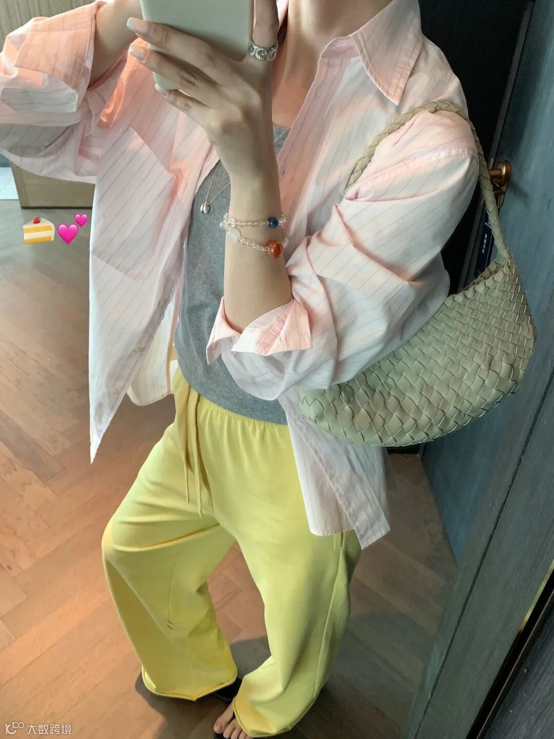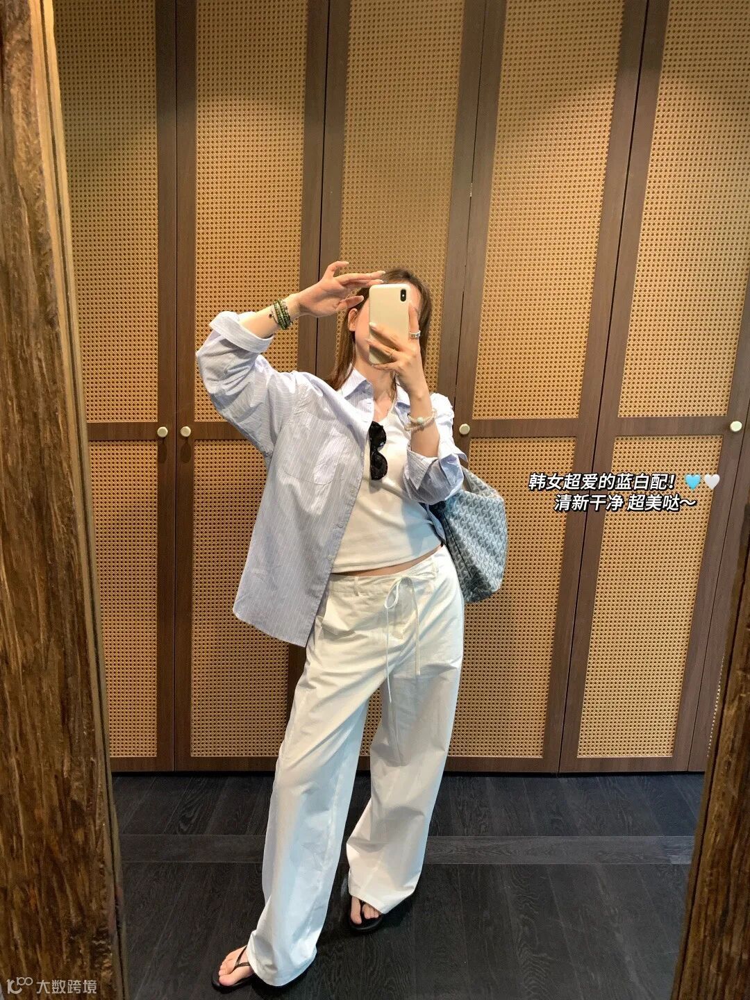 纯纯韩国进口来的 和工装裤都是我年前下的订单!最近这个粉色、蓝色条纹在韩国爆单了