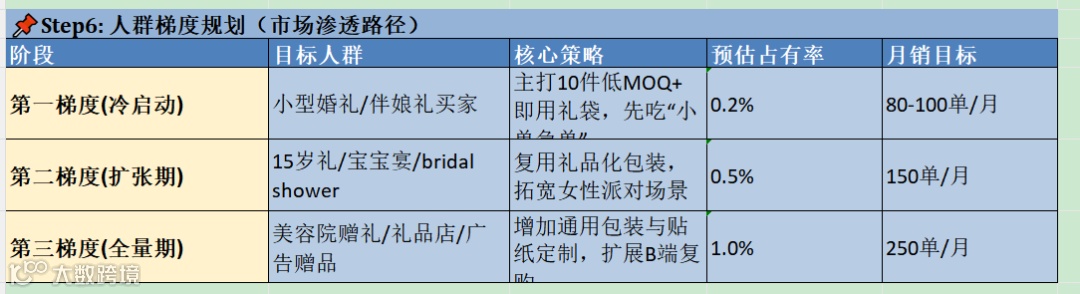 表里后面的人群梯度规划,其实也很值钱。第一阶段冷启动,不是去吃所有女性用户,而是先吃“小型婚礼/伴娘礼买家”,目标月销80到100单。第二阶段再复用礼品化包装,去拓 15 岁礼、宝宝宴、bridal shower 这些女性派对场景,月销150单。第三阶段才考虑美容院赠礼、礼品店、广告赠品这些偏 B 端的复购场景,目标月销250单。