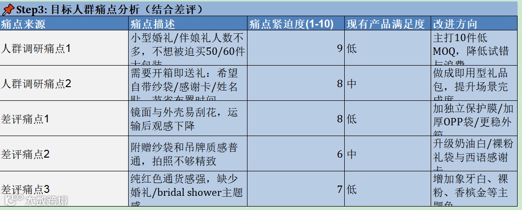再看痛点分析,这一步才是真正把“竞品分析”变成“改款动作”。表里最值钱的不是差评关键词,而是痛点被重新组织过。小型婚礼和伴娘礼人数不多,不想被迫买50件、60件大包装,这个痛点紧迫度9,现有产品满足度低。买家希望开箱即送,最好自带纱袋、感谢卡、姓名贴,节省布置时间,这个痛点紧迫度8。镜面和外壳容易刮花,运输后观感下降,紧迫度8。附赠纱袋和吊牌质感普通,拍照不精致,紧迫度6。纯红色通货感太强,缺少婚礼或 bridal shower 主题感,紧迫度7。
