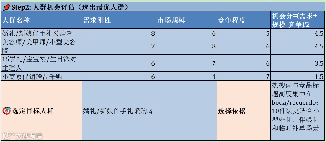 所以表里又做了一轮机会评估。婚礼/新娘伴手礼采购者,需求刚性8,市场规模6,竞争程度5,机会分4.5。美容师/美甲师/小型美容院,需求刚性7,市场规模8,竞争程度6,机会分也是4.5。表面看两个人群打平,很多人这时候就会说,那两个都做。错。新品最怕贪。AI Agent最后选的是婚礼/新娘伴手礼采购者,不是因为美容院人群不行,而是因为婚礼人群的热搜词、竞品标题和产品结构与“10件装/多件装/低MOQ”这件事吻合得更紧。