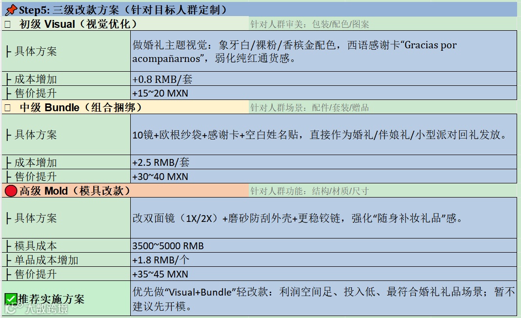 这时候 我们的AI agent 针对精准人群才开始给改款建议,而且不是一句空话式的“建议做差异化”,而是分层给。第一层是 Visual 轻改,做婚礼主题视觉,用象牙白、裸粉、香槟金替代通货红,配西语感谢卡“Gracias por acompañarnos”,成本增加0.8元人民币一套,售价可以提升15到20比索。第二层是 Bundle 组合改款,把10镜、欧根纱袋、感谢卡、空白姓名贴打成即用型礼品包,成本增加2.5元人民币一套,售价可以提升30到40比索。第三层才是 Mold,也就是双面镜、磨砂防刮外壳、更稳铰链这种偏结构和工艺层面的重改,模具成本3500到5000元人民币,单品成本再加1.8元。