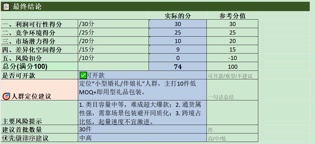 回到这个镜子案例,最终分数是可开款,首批建议30件,优先级中高。这个结果看起来很普通,但它比“可以做”值钱太多。因为它告诉你的不是情绪,而是节奏。它在说,这不是一个值得你压重货、赌爆款的项目,但它是一个非常适合你用低投入做出第一批验证的小盘子。你别想着靠它一年卖成类目神话,但它很适合被做成一个稳定的小爆款模板。模板一旦跑通,后面复制的是方法,不是运气。