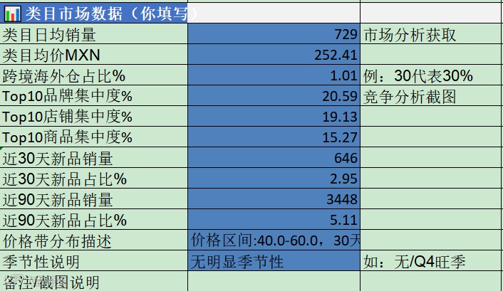 接下来再看类目,不看类目的话你根本不知道这笔钱该不该花。表里显示,类目日均销量729单,类目均价252.41比索,Top10品牌集中度20.59%,Top10店铺集中度19.13%,Top10商品集中度15.27%,近30天新品销量646,近30天新品占比2.95%,近90天新品销量3448,近90天新品占比5.11%,跨境海外仓占比只有1.01%。