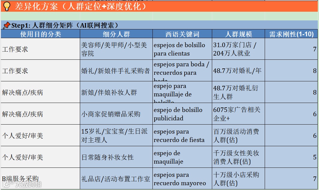 再看人群矩阵,这一步才是真正让 AI agent 和普通表格拉开差距的地方。我们不是看完类目和竞品,就直接拍脑袋决定“主打女性补妆”。Agent会先把这个类目里可能的人群全部拉出来,再做一轮机会评估。最后拉出的不是一个笼统人群,而是一张有规模、有需求刚性、有关键词承接的人群表。