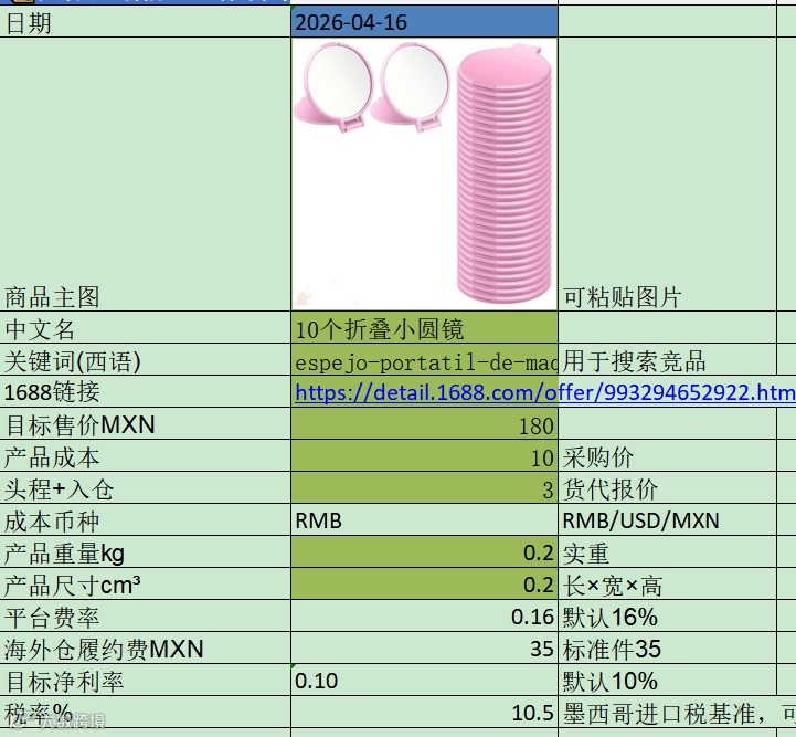 最近我们挖到美客多一个化妆镜产品(不方便完全展示竞品,只截主图做参考),产品本身非常普通,几十个折叠小圆镜,1688上就是典型的通货。大多数卖家看到这种货,第一反应都一样:没什么技术含量,直接找个卖得好的链接照着抄,竞品卖20个,我就卖30个,竞品卖50个,我就卖100个,要么低价挂上去,跑广告,实在不行我就测评刷刷刷。可这类打法现在最大的毛病,不是粗糙,而是低效,低效在同一纬度上的竞争。因为你是在和已经跑起来的人比“谁更像”,而不是在和市场比“我还能从哪里切进去”。