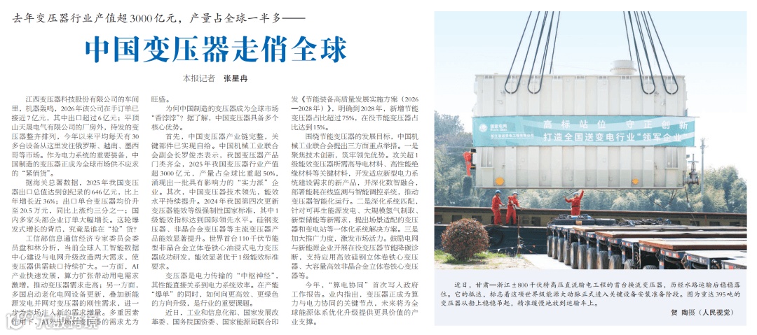 2026年3月25日人民日报文章《中国变压器走俏全球》