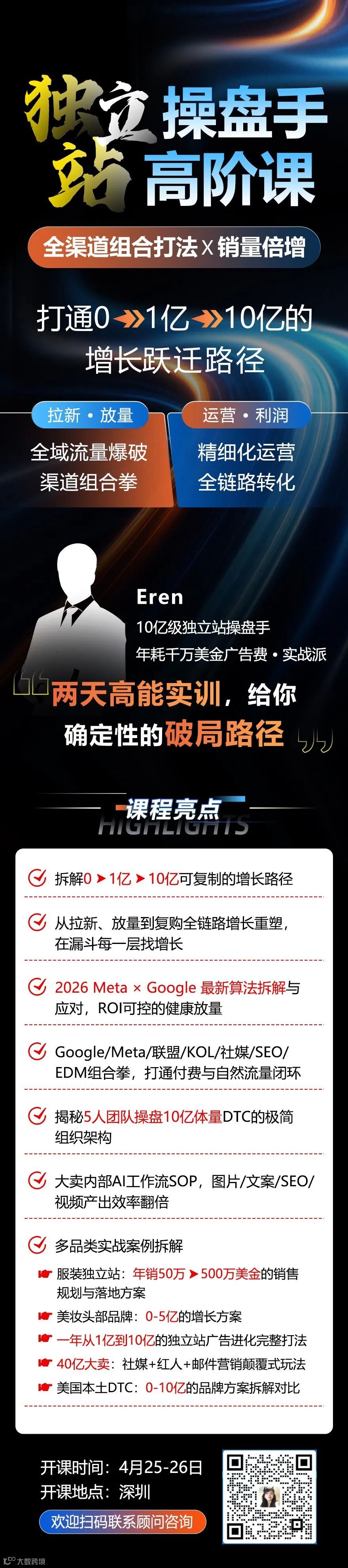为解决这些痛点,我们特邀Eren老师,4月25-26日两天线下分享《独立站操盘手高阶课 - 全渠道组合打法 x 销量倍增》,以案例+方法论+实操的形式,系统提升独立站操盘能力,让销售增长落地。
