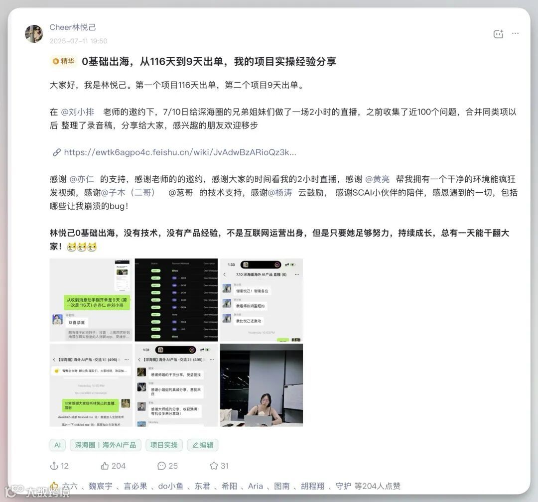 回顾两年关键节点:2024年3月20日加入生财,9月4日获首篇精华贴;2025年2月11日首获龙珠,6月18日出海项目首单,9月20日登千人演讲台。每个里程碑印证了“乾坤未定,你我皆是黑马”的信念。