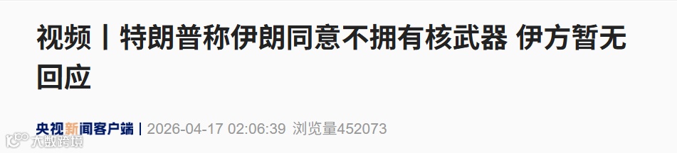 4月16日,特朗普表示美方已获得确保伊朗不发展核武器的"极具分量"声明,承诺有效期将超20年。其称"伊朗已同意几乎所有要求",协议前景"非常乐观"。