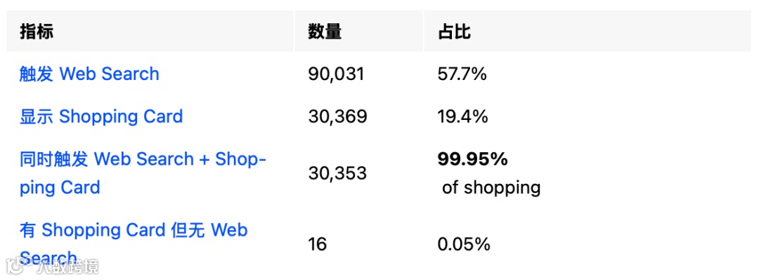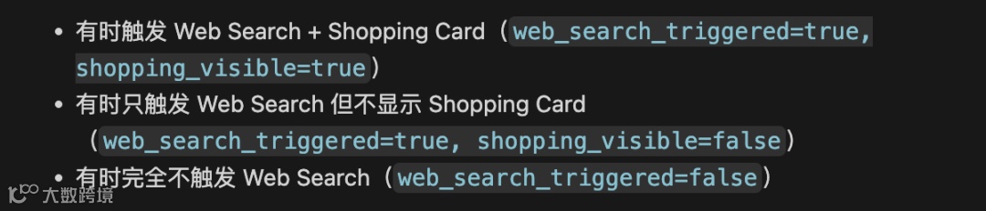 核心结论:100% 的商品卡展示依赖 Web Search 的前置触发。