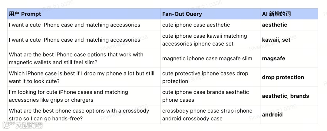例如输入"cute iphone case",AI 会生成"cute iphone case aesthetic"等变体——原始请求中从未出现的"aesthetic"一词被精准注入,体现 AI 对用户购买意图的深度重构。