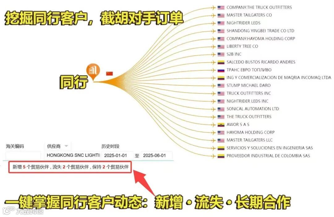 :一眼看清同行抢了哪些客户、流失了哪些资源、稳住了哪些合作、抢占了哪些市场。这个功能超实用,如果你没有目标的情况下,平时多关注同行的客户动向。