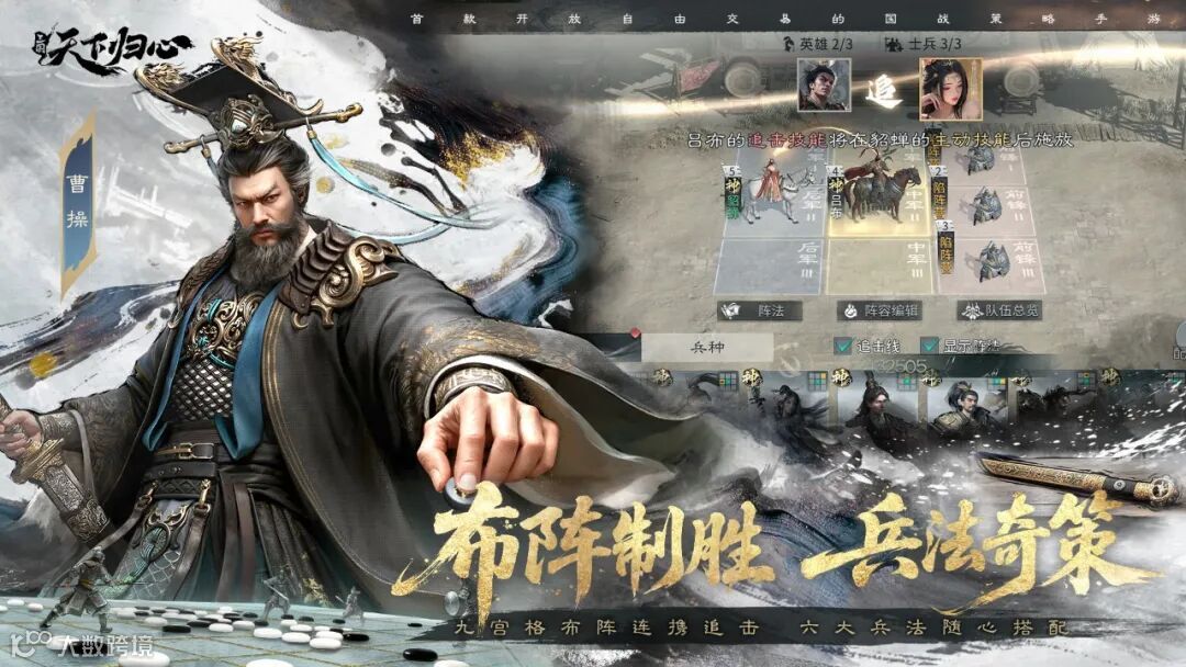 在战斗乐趣层面,由于传统SLG更加重视长线养成,战斗更像是对养成结果的检验,战斗本身的博弈趣味性并不强。而《三国:天下归心》则在战斗层面的策略博弈上花费了不少心思。例如一般SLG在战前布阵上要么是主副将搭配要么是提供固定阵型选择,而《三国:天下归心》则独创了"三线九宫"体系,允许玩家在九宫格内随意调整站位,不同角色技能受站位影响,触发追击选择和行动顺序也允许玩家自由编辑,大大增强了战术博弈深度与趣味性。