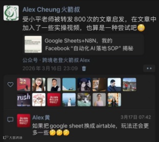 我写蕾蕾,是因为我想学社群经营。 Google Sheets+N8N,我的Facebook“自动化AI落地SOP” 揭秘Facebook“降维打击”的四层矩阵玩法