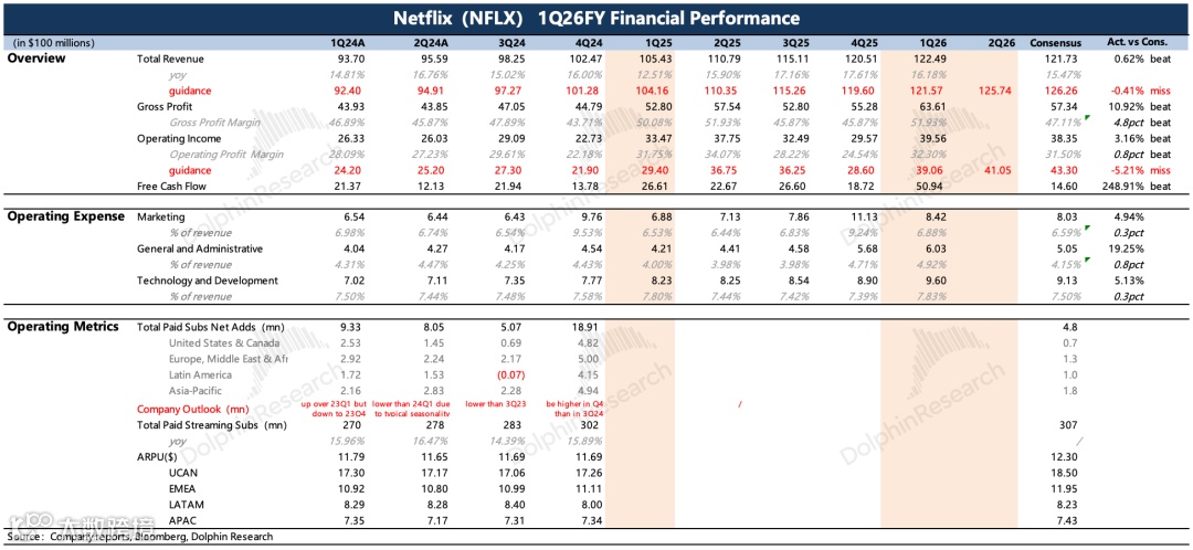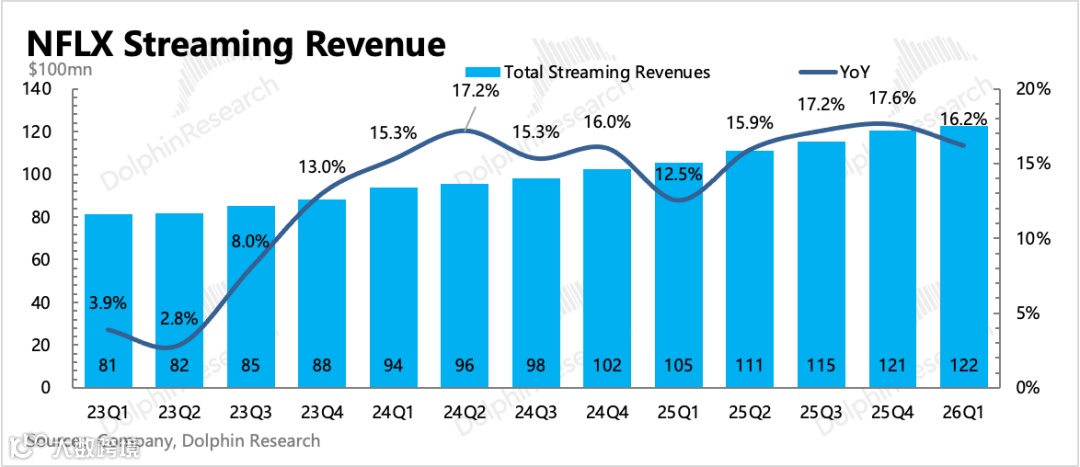 一季度收入122亿美元,同比增长16%(汇率中性增长14%),超预期主因用户订阅规模与广告收入增长。当季无大规模涨价,美国地区提价影响将延至二季度体现。但管理层指引二季度收入不足126亿美元,隐含增速放缓至13%;全年收入指引维持507~517亿美元(增速12%~14%),其中广告收入预计达30亿美元,儿童游戏应用“Netflix Playground”将拓展会员权益。