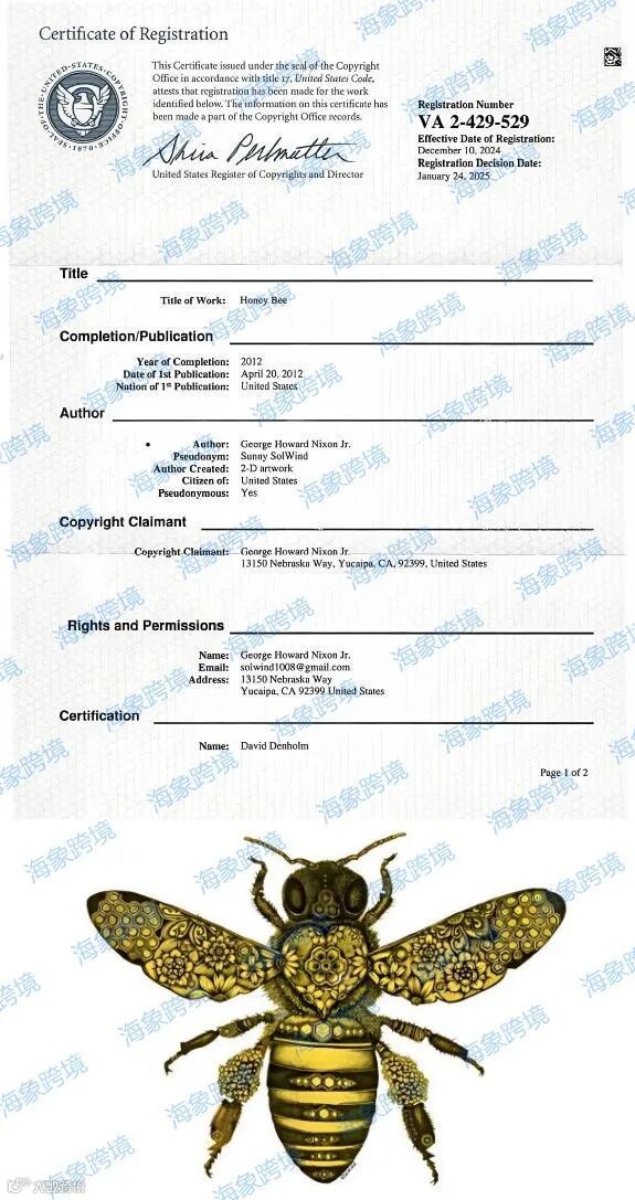 原告为知名艺术家,其创作风格融合部落及萨满教传统元素。2011年创作的蜜蜂主题插画持续用于环保类产品合作,受版权保护。
