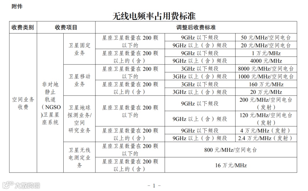 一、优化空间业务收费标准体系。非对地静止轨道(NGSO)卫星星座系统和网络化运营的对地静止轨道(GSO)卫星系统,由按照空间电台、地球站分别向卫星运营商和网内地球站设台单位收取,调整为根据空间业务实际占用带宽向卫星运营商收取。对星座卫星数量在200颗以下的NGSO卫星星座系统,按照空间电台数量收费;对星座卫星数量在200颗及以上的NGSO卫星星座系统,统一按系统收费。
