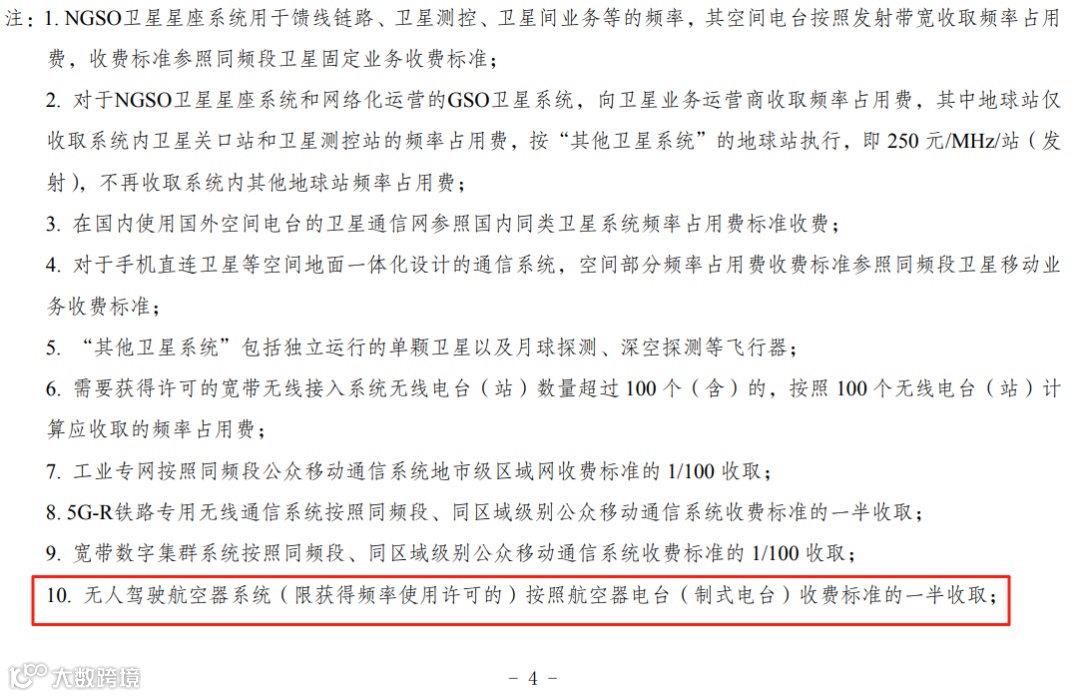 值得注意的是,附件《无线电频率占用费标准》第10条明确提到,无人驾驶航空器系统(限获得频率使用许可的)按照航空器电台(制式电台)收费标准的一半收取。