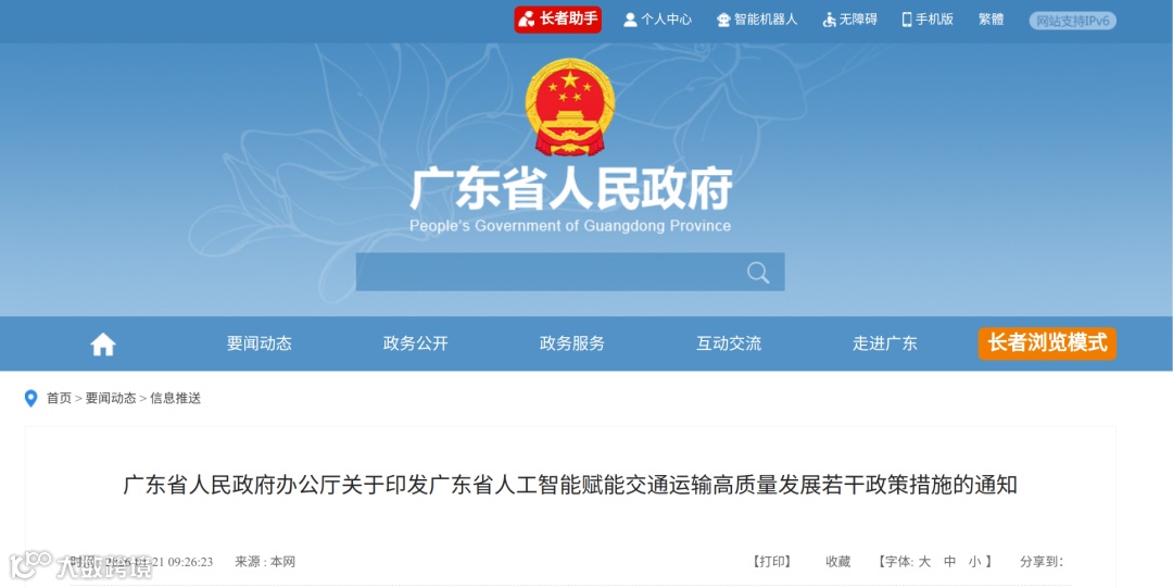 广东省人民政府办公厅关于印发广东省人工智能赋能交通运输高质量发展若干政策措施的通知