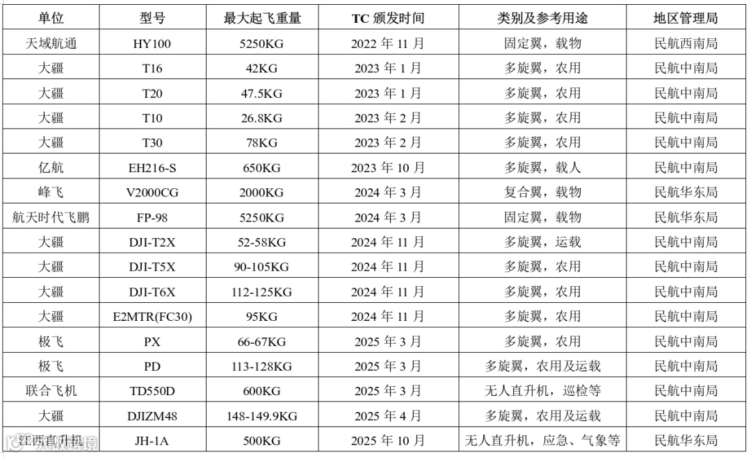 无人机适航审批是中国民航局对民用无人机系统设计安全性的一种认可,相当于无人机的“准生证”,是商业化运营的必要条件,包括型号合格证(TC)、生产许可证(PC)和标准适航证(AC)三证。截至目前,我国已有 17 款民用无人机 /eVTOL 获得型号合格证(TC)。在已获得TC证的17个型号中,以多旋翼农业无人机为主,占11个,无人直升机2个,固定翼运输无人机2个,多旋翼载人、复合翼载物eVTOL各1个。