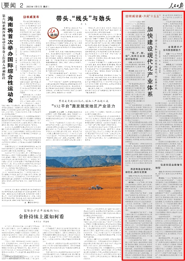 近日,围绕贯彻落实中央经济工作会议精神,推动“十五五”良好开局的思路举措,工信部党组书记、部长李乐成接受了中央媒体联合采访。1月13日,《人民日报》刊发了采访李乐成部长的报道《加快建设现代化产业体系》。