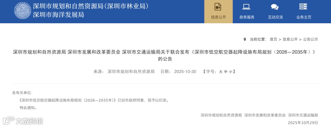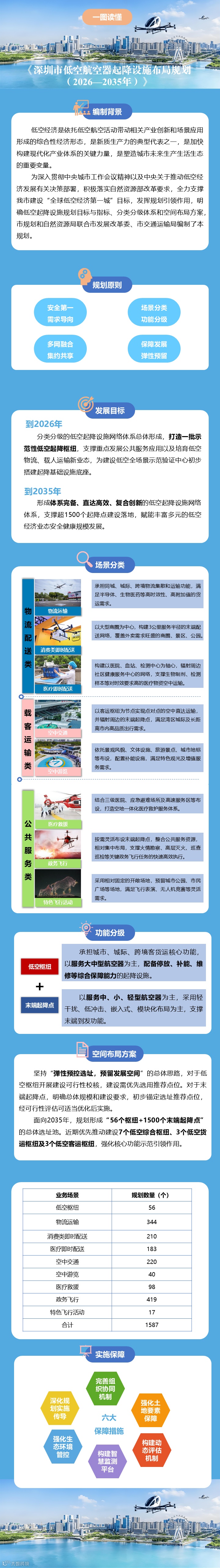 10月30日,深圳市规划和自然资源局、深圳市发展和改革委员会、深圳市交通运输局联合发布《深圳市低空航空器起降设施布局规划(2026-2035年)》。