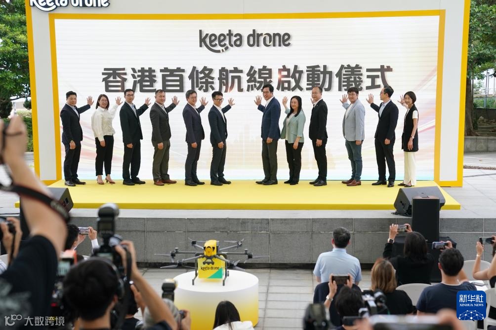 6月6日,在香港科学园,嘉宾共同启动香港低空经济监管沙盒框架下的首条常态化无人机配送航线。 新华社发(王申摄)