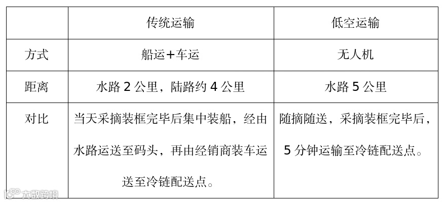 此次尝试是国内首次通过无人机实现远距离跨水域荔枝配送,现有无人机作物运输一般在2公里范围内,超过2公里可视为远距离配送,此次跨水域配送单程距离5公里,5分钟就从采摘岛运到了冷链打包点,单次运输超50斤,能实现随摘随送,最大程度锁鲜,不仅有效减少下雨天气对荔枝运输带来的影响,还在鲜果采摘的“最初一公里”可缩减一半的时间。