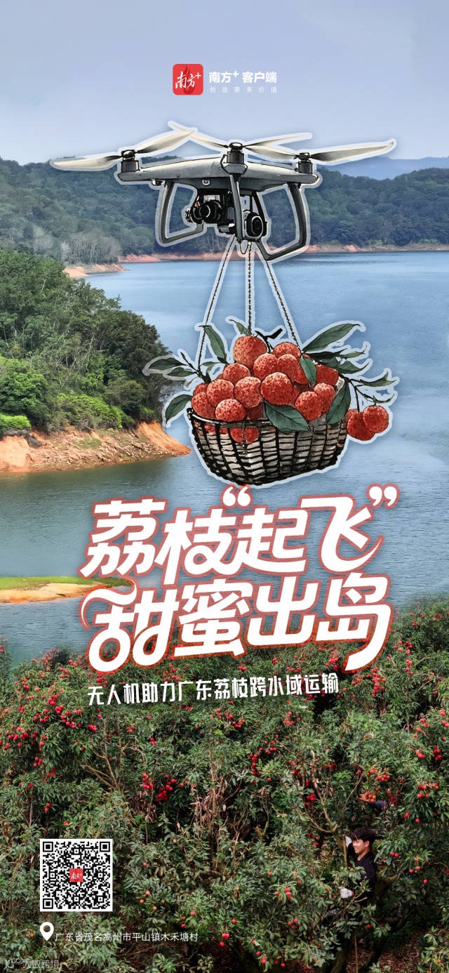 “三、二、一,起飞!”茂名高州市平山镇木禾塘村湾边岛,无人机悬停于一块空地的上方,工作人员迅速将装好筐的50斤荔枝挂上无人机。随着飞手熟练操作遥控器,启动、飞行……很快,无人机向着对岸飞去。5分钟后,荔枝“飞”过约5公里水域,送达仓储物流中心。这是广东首次实现跨水域无人机运输荔枝,助力甜蜜出岛。