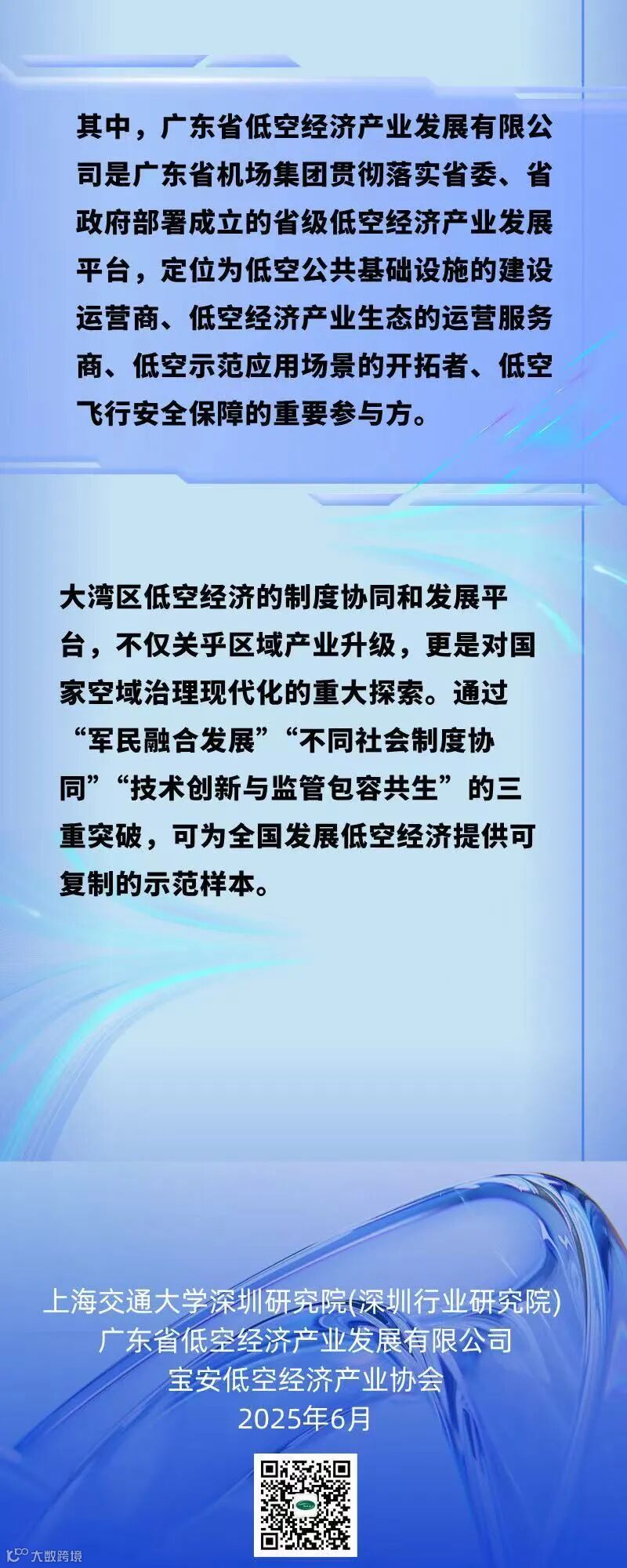 该蓝皮书由上海交通大学深圳产业研究院、广东省低空经济产业发展有限公司、宝安低空经济产业协会联合编撰,汇集了粤港澳三地专家智慧,系统性提出大湾区发展低空经济的“协同创新”方法论,创新性提出七大协同路径,力争为中国和全球城市群的低空经济治理提供样板方案。