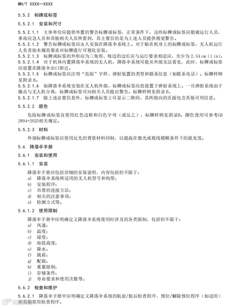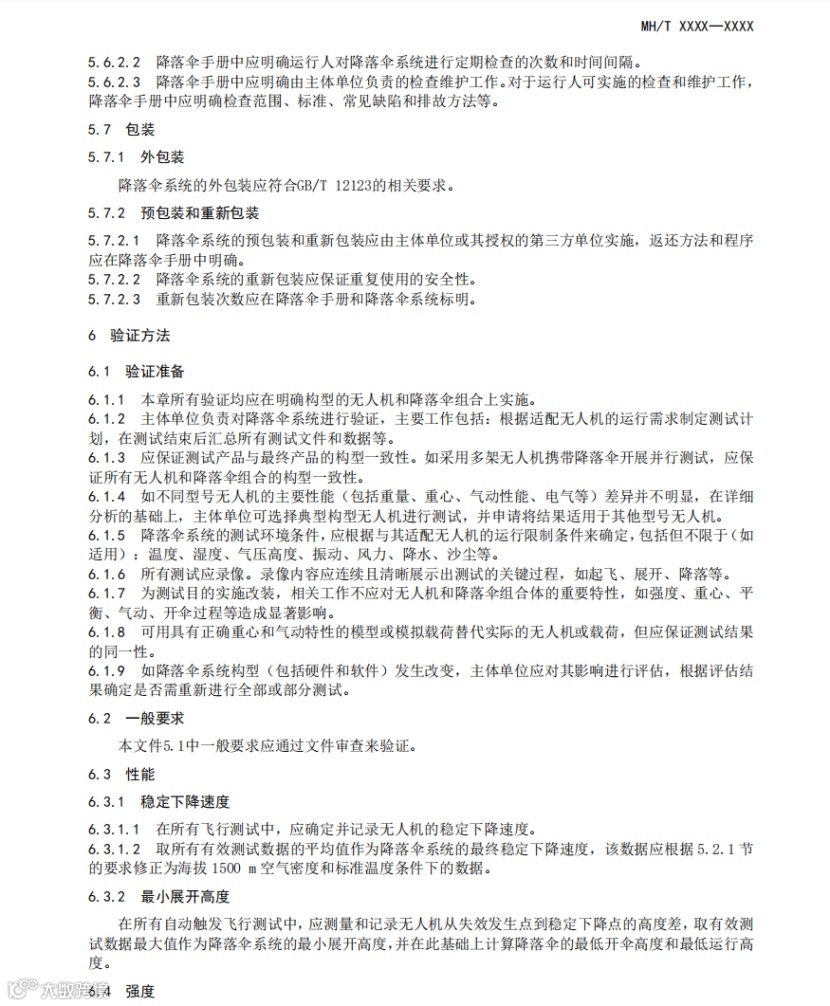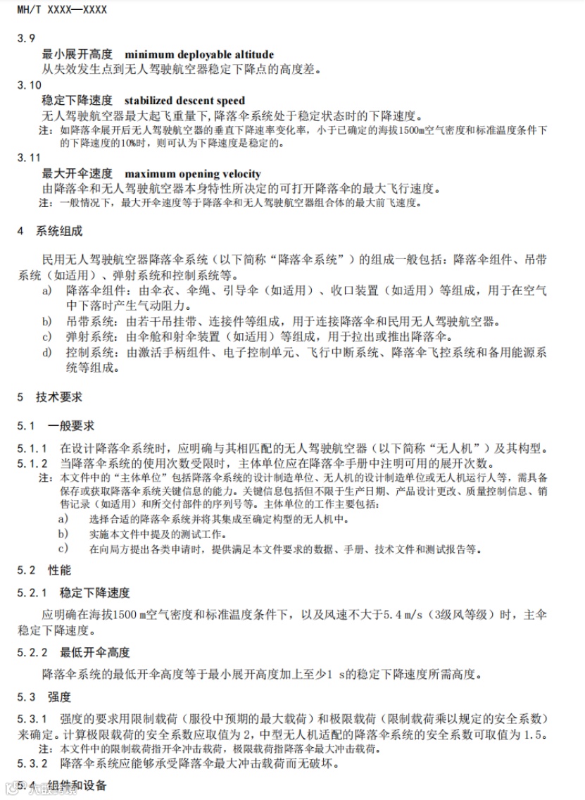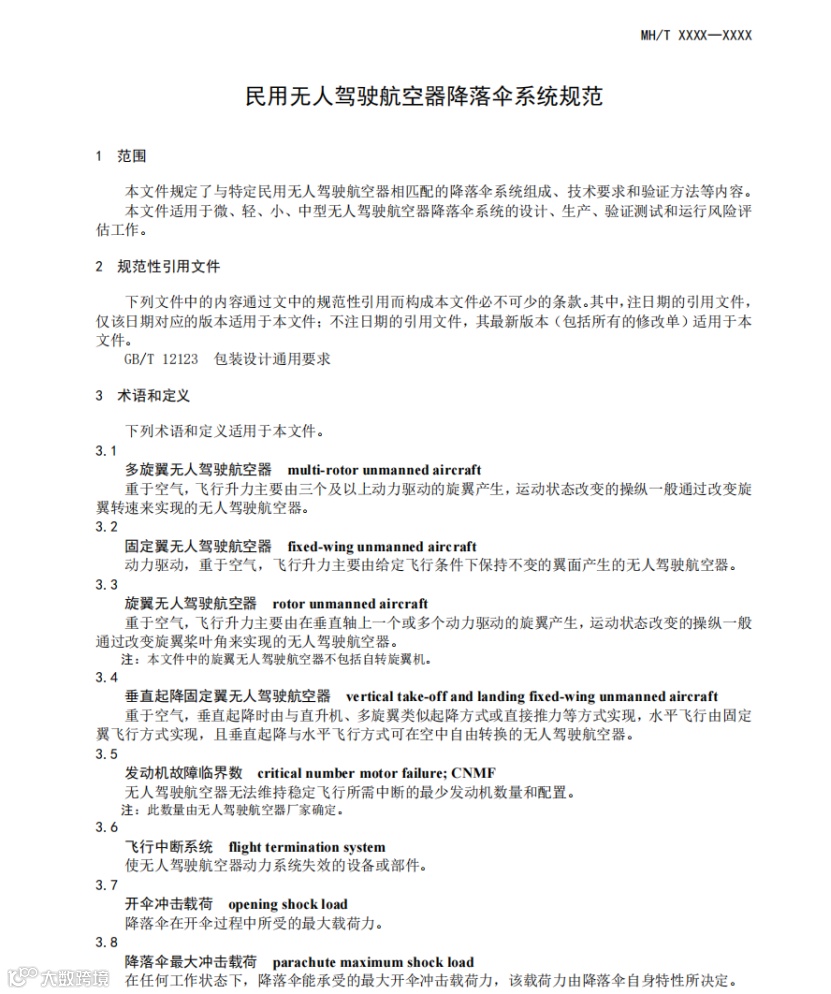 该文件规定了与特定民用无人驾驶航空器相匹配的降落伞系统组成、技术要求和验证方法等内容。适用于微、轻、小、中型无人驾驶航空器降落伞系统的设计、生产、验证测试和运行风险评估工作。