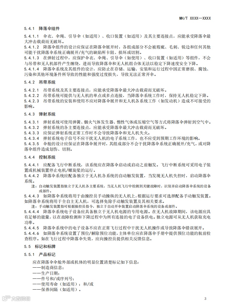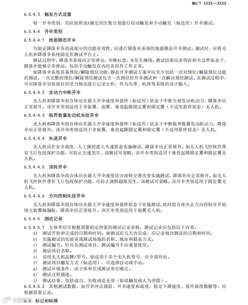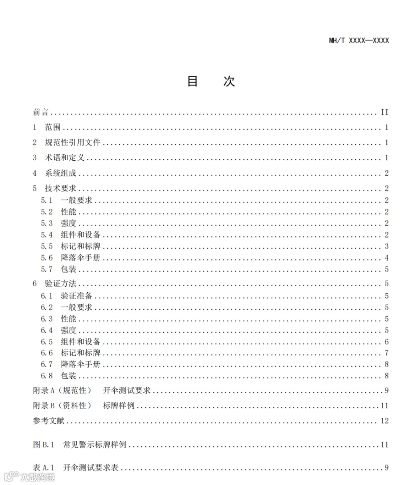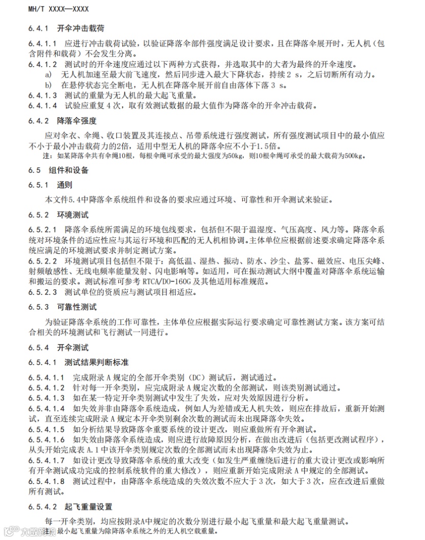 该文件规定了与特定民用无人驾驶航空器相匹配的降落伞系统组成、技术要求和验证方法等内容。适用于微、轻、小、中型无人驾驶航空器降落伞系统的设计、生产、验证测试和运行风险评估工作。