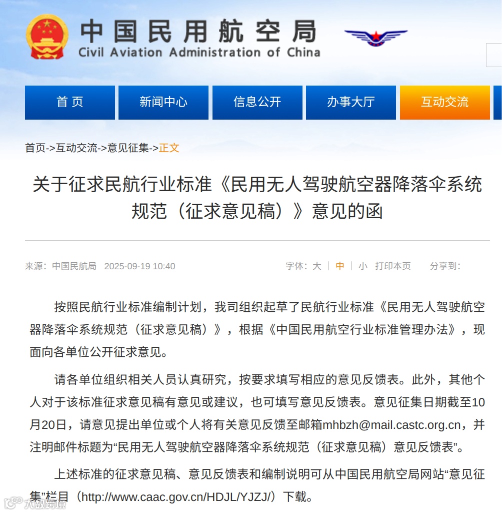 广东低空经济公司近日,民航局航空器适航审定司发布关于征求民航行业标准《民用无人驾驶航空器降落伞系统规范(征求意见稿)》意见的函。意见征集日期截至10月20日。