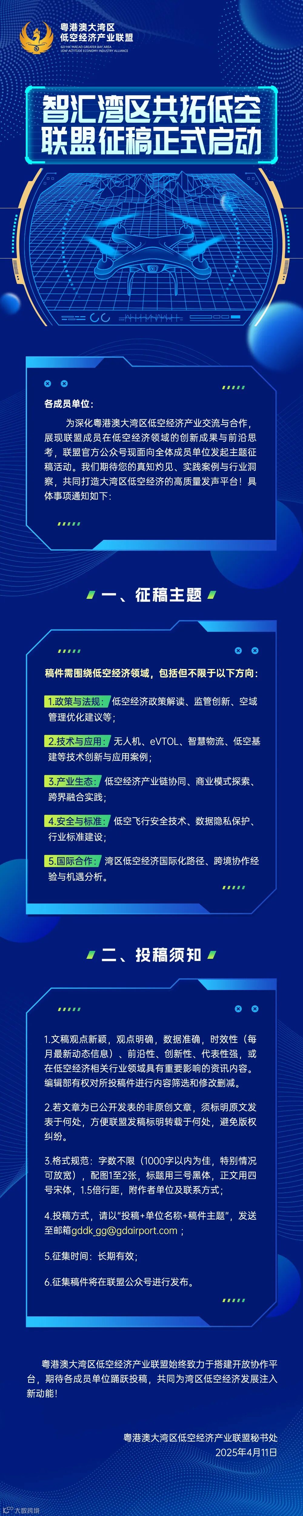 粤港澳大湾区低空经济产业联盟成立于2024年7月,由广东省发展和改革委员会指导,低空经济领域的相关企事业单位共同发起成立,成员近250家。为进一步扩大联盟影响力,即日起省低空公司携手联盟秘书处发起主题征稿活动。