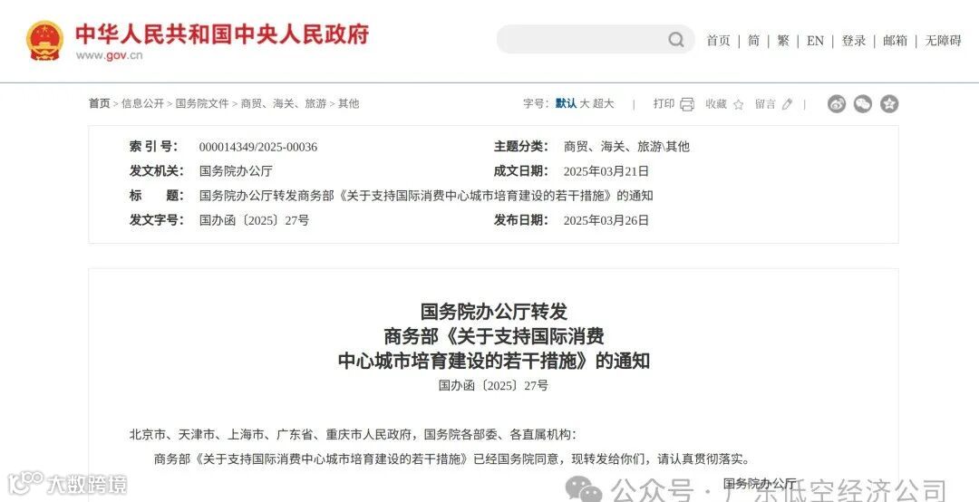 3月26日,国务院办公厅转发商务部《关于支持国际消费中心城市培育建设的若干措施》,支持上海市、北京市、广州市、天津市、重庆市加快国际消费中心城市培育建设,打造具有全球吸引力的消费环境,全方位扩大国内需求,扩大高水平对外开放,推出八项政策措施。其中明确,支持相关城市增设境外直飞航线。探索在具备安全条件的地区开通低空物流航线、开发低空旅游项目,拓展低空消费场景。推动人工智能、虚拟现实、大数据等技术在消费领域深化应用,打造一批“人工智能+消费”场景。