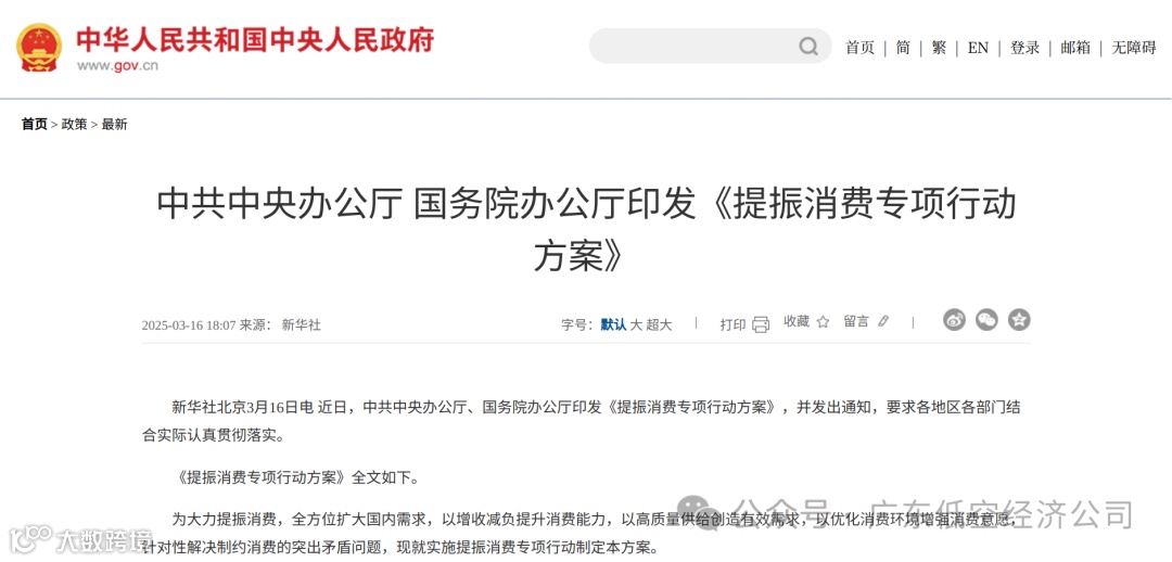 3月16日,中共中央办公厅、国务院办公厅印发《提振消费专项行动方案》。行动方案部署了8方面30项重点任务,包括城乡居民增收促进行动、消费能力保障支持行动、服务消费提质惠民行动、大宗消费更新升级行动、消费品质提升行动、消费环境改善提升行动、限制措施清理优化行动、完善支持政策。
