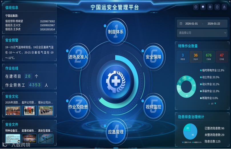 安全管理:严守“五关六维”,筑牢本质安全防线。围绕程序、准入、进场、作业、管控“五关”,构建制度体系、视频监控等六大功能模块。内置7752条隐患标准库,实现“一人一码”实名制进场;接入视频6655路,AI智能识别风险;累计办理电子作业票41,358条,排查隐患7195项(闭环率100%),全面实现高风险作业线上审批、全程留痕、动态受控,本质安全水平显著提升。