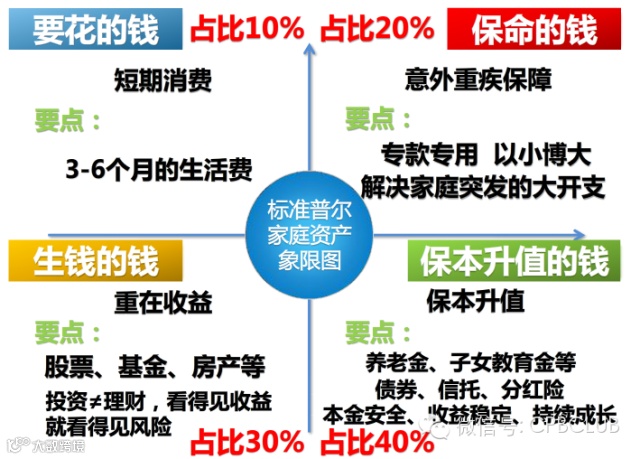 “标准普尔家庭资产象限图”把家庭资产分成四个账户,这四个账户作用不同,所以资金的投资渠道也各不相同。只有拥有这四个账户,并且按照固定合理的比例进行分配才能保证家庭资产长期、持续、稳健的增长。
