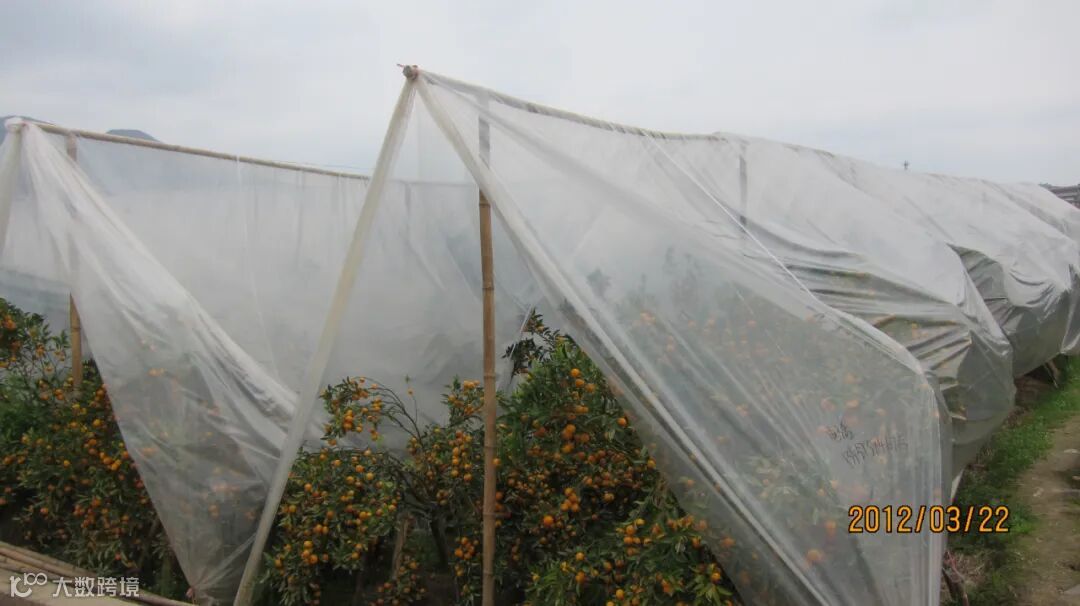 对沙糖橘、沃柑、金橘、脆蜜金柑、春见、不知火等容易因霜冻、持续降雨导致裂果落果的品种,在11月中下旬,密切关注天气预报,在霜冻、持续降雨到来前进行树冠盖膜,以防霜冻、持续降雨造成裂果落果。盖膜前全园喷杀虫杀菌剂1次预防病虫害:43%联苯肼酯悬浮剂2000倍+60%吡唑醚菌酯·代森联水分散粒剂(百泰)1000倍或80%代森锰锌可湿性粉剂600倍或25%咪鲜胺乳油500~600倍;或73%炔螨特乳油2000倍液和25%咪鲜胺乳油500~600倍。脆蜜金柑在树冠盖膜的同时还要盖上防鸟网防止鸟类危害果实。