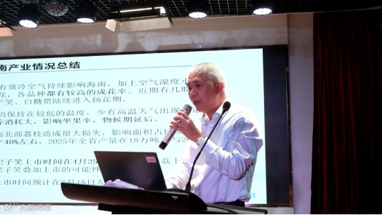 海南省农业科学院热带果树研究所、国家荔枝产业技术体系海口综合试验站站长王祥和首先对2025年海南荔枝的生长情况进行了详细介绍。他指出,海南荔枝素有“中国第一红”的美誉,不仅品质优越,而且上市时间最早,在全国荔枝产业中占有重要地位。今年,排除台风因素,海南地区荔枝的成花率普遍在95%以上,预计将迎来一个高产年。王祥和还提到,海南荔枝品种结构相对单一,以妃子笑为主,占比约90%,这导致抵御风险能力较低,果实集中上市易引起价格波动。因此,他建议丰富种植品种,延长销售期,以降低销售压力,提升产业效益。
