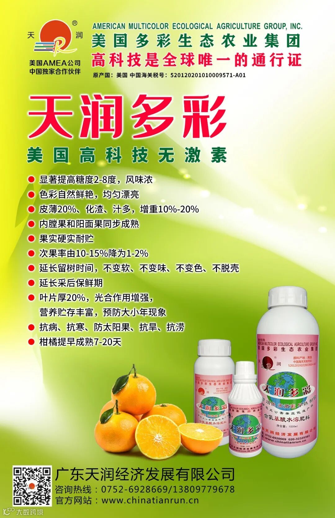 另外,天润多彩对果色均匀和自然鲜艳有非常明显效果,而且糖度提高到20度,比对比提高了约5度,起沙好,皮薄化渣汁多,同大小果个增重约10%,硬实耐运储,缩短采收期。