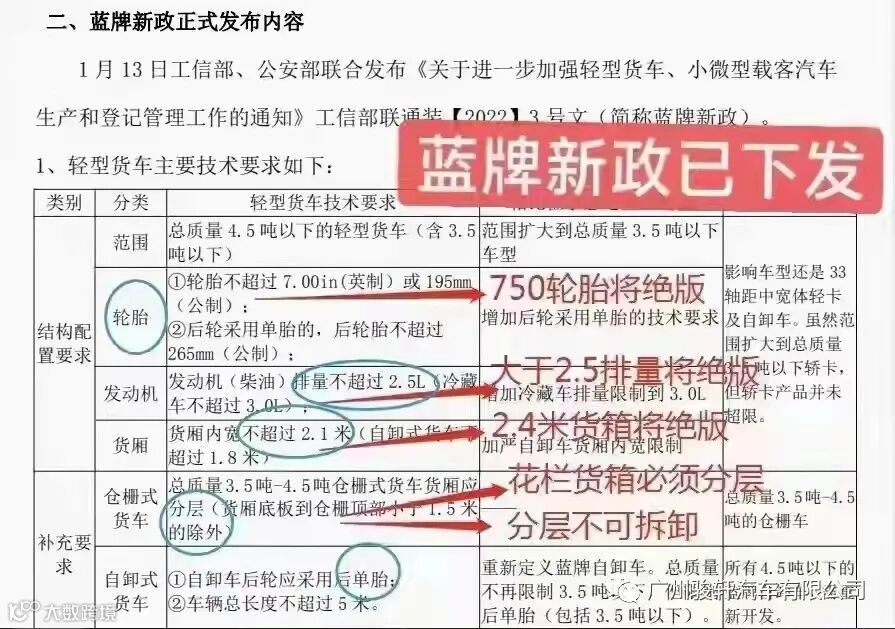 蓝牌新政已公示, 2022年3月1日起生产出厂的车辆将实行新政, 发动机排量不能超2.5L; 货厢宽度不能超2.1米; 轮胎不可以超过700R; 目前有少量现车:宽2.3米,排量3.0,轮胎750; 有需求的卡友朋友们,抓住最后机会,到店试乘试驾,先到先得!