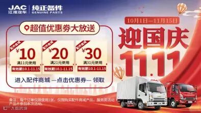 双11期间,江淮卡友特推出客户感恩活动,备件商城将发放10元、20元、30元三种优惠券,以此回馈广大卡友