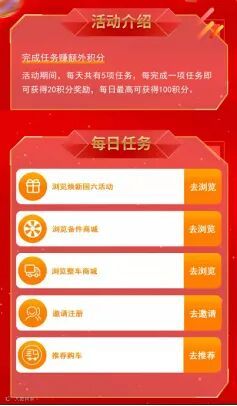 完成任务赚额外积分,活动期间,每天分别有5项任务(浏览焕芯国六活动、浏览备件商城、浏览整车商城、邀请注册、推荐购车),每完成一项任务即可获得20积分奖励,每日最高可获得100积分。