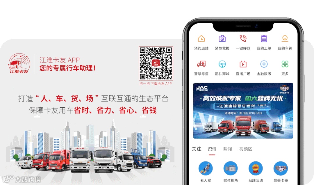 活动期间进站用户可享:①车辆免费检查;②注册江淮卡友APP分别赠送20元工时券1张,20元备件抵用券1张,可在当地服务站抵扣备件或工时费;③20分钟救援响应机制,货运无等待;④货运高峰期提供免费上门维保。(活动时间:2021年10月23日-11月30日)